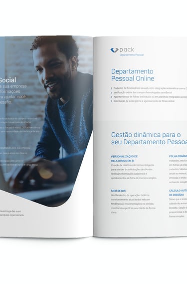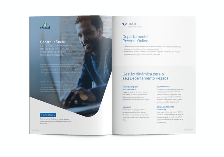 A Alterdata, empresa consolidada no desenvolvimento de softwares para contabilidade, precisava de um material informativo para apresentar o sistema Pack em feiras e eventos. O desafio era organizar um grande volume de informações de forma clara, atrativa e de fácil leitura, especialmente para um público técnico.